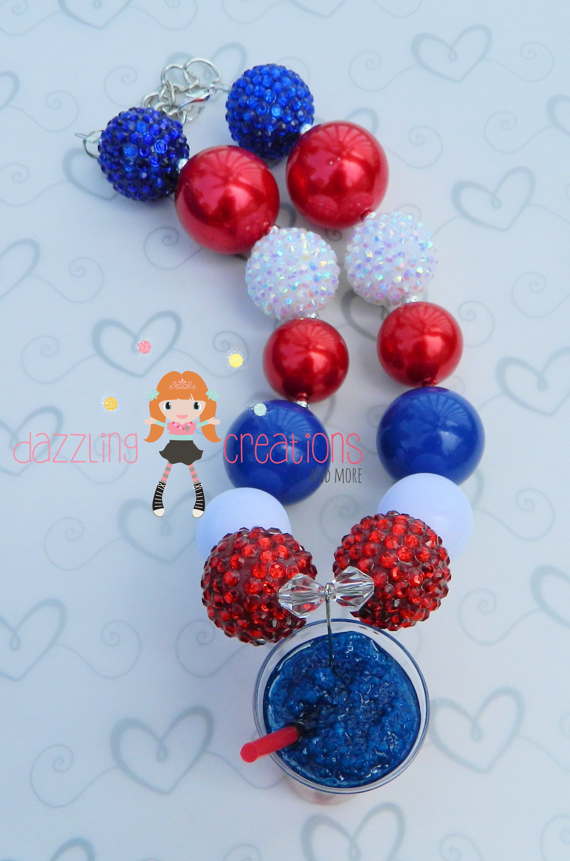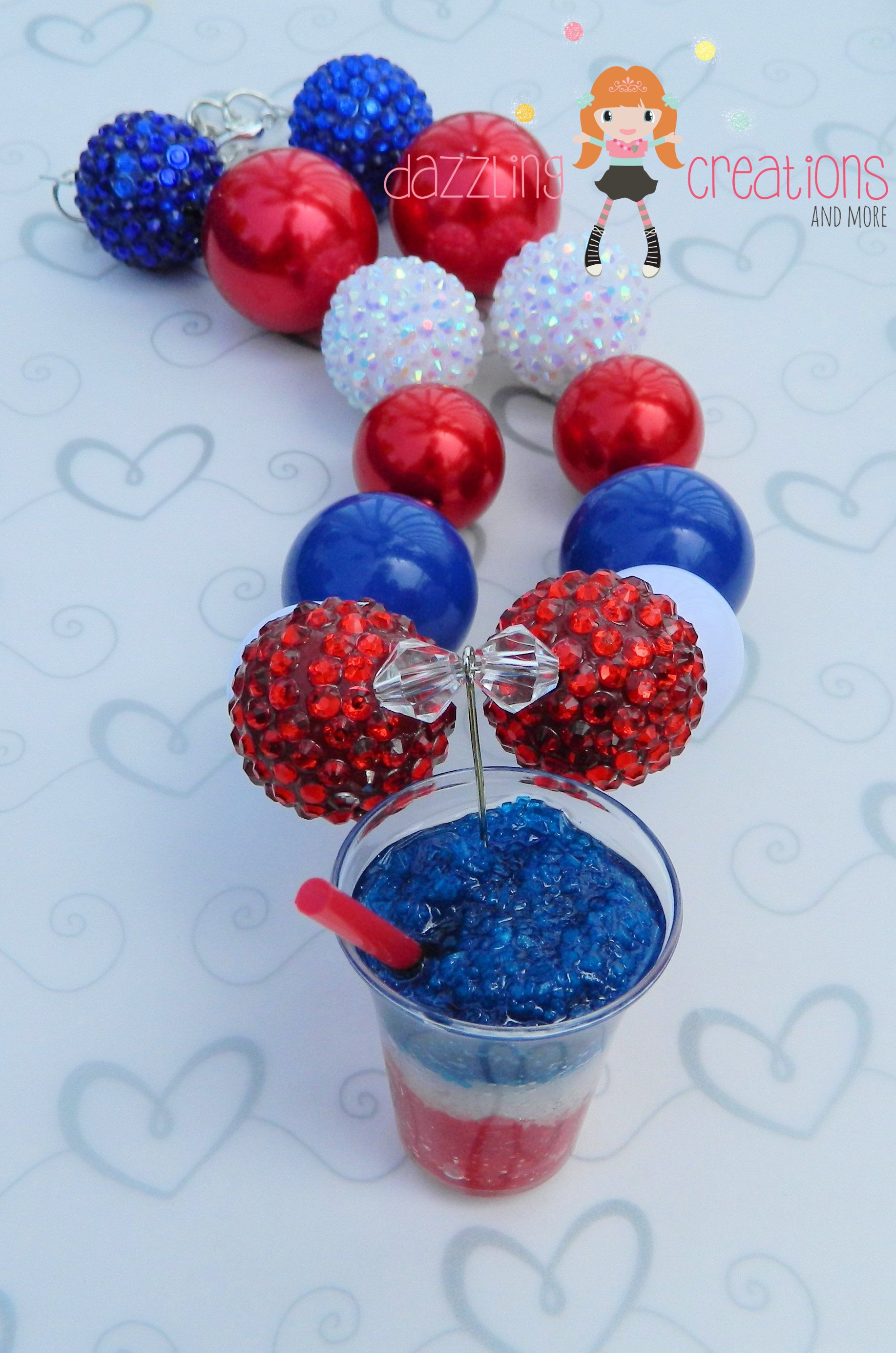 Patriotic 4th of July Red White Blue Ice Cream Slushy Pendant Chunky Necklace & Hair Bow Set Perfect Photo Props