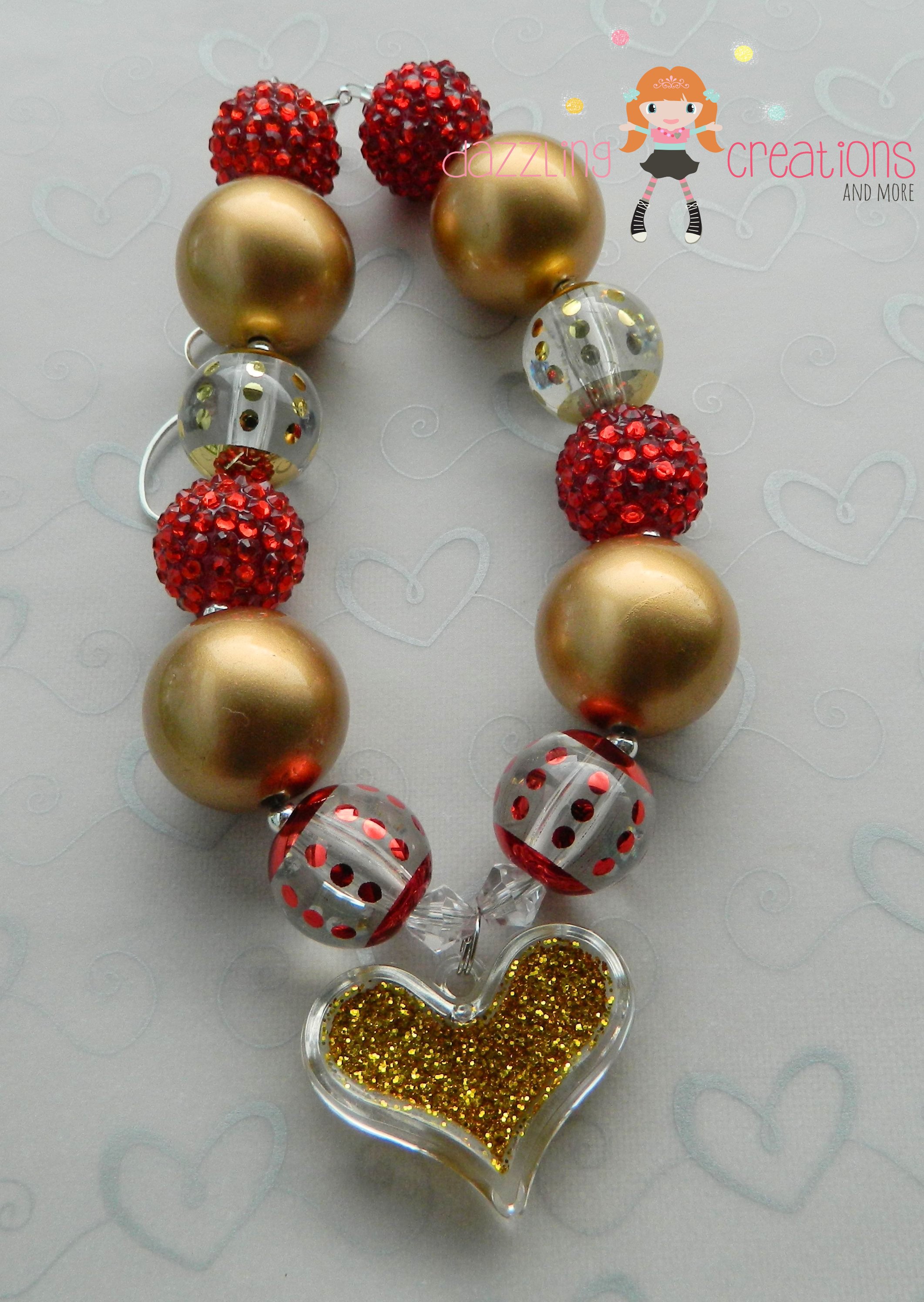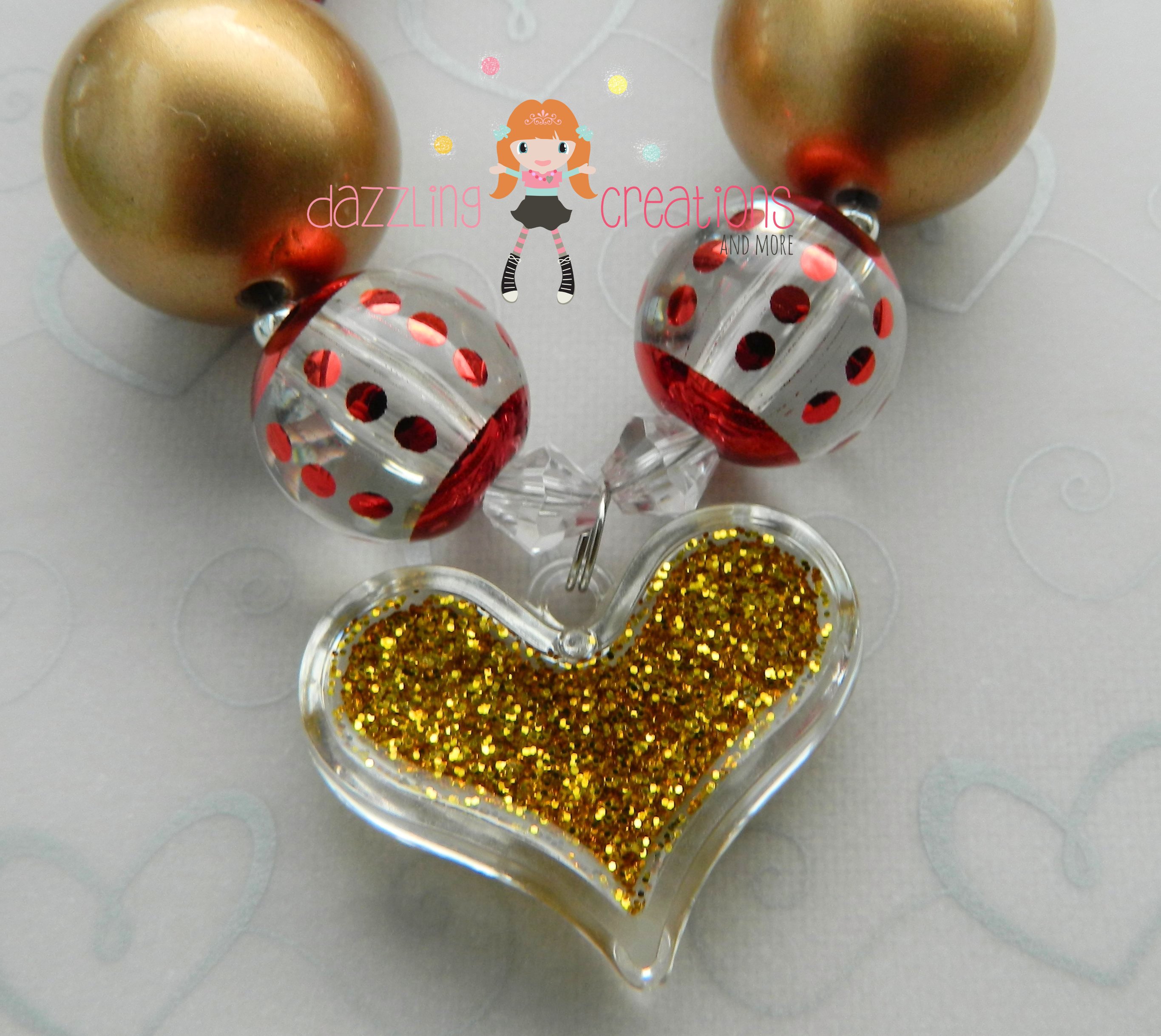 Gold Heart Christmas Chunky Necklace/Red Green/Photo Props/Bubblegum Beads/Girls Jewelry