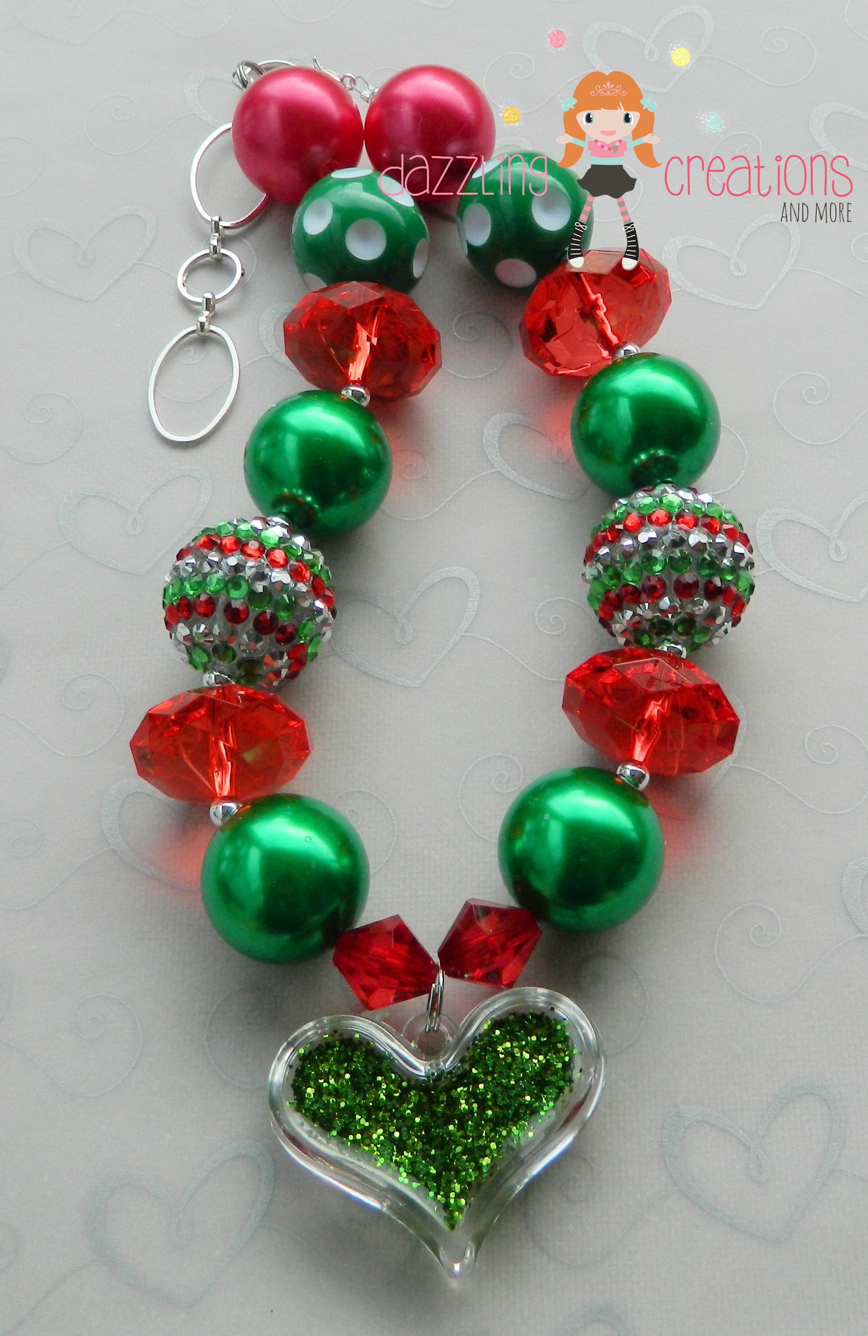 Green Heart Christmas Chunky Necklace/Red Green/Photo Props/Bubblegum Beads/Girls Jewelry/Hair Accessories